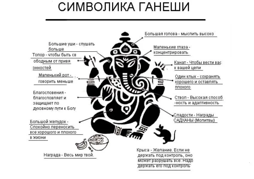 Большие уши - способность услышать всех просящих. Голова слона - это символ проявления повиновения и почитания. Единственный бивень - проявление отваги, силы, преодоления трудностей. Большой живот - отождествляется с добротой, щедростью, достатком. Две стопы - это сила знания и действия.