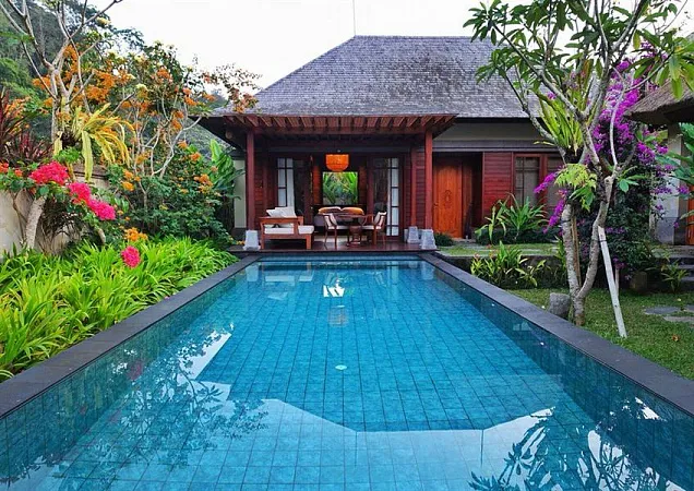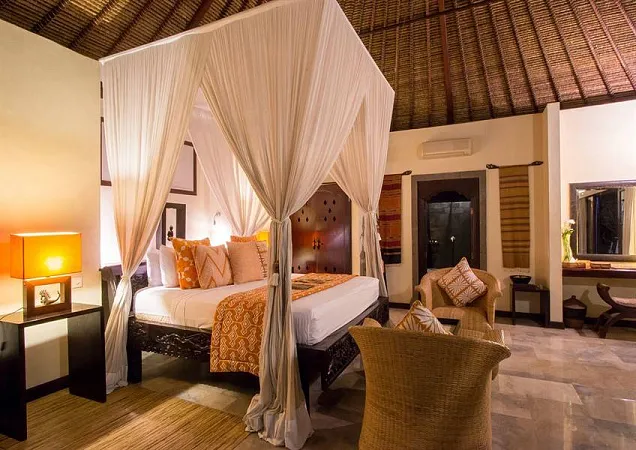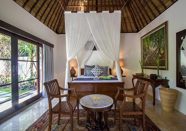 Роскошная вилла Vajrapani с одной спальней — это комфортный номер с невероятно уютной атмосферой, современной, удобной мебелью в традиционном балийском стиле, дизайнерской отделкой в теплых тонах. Широкая, двуспальная кровать с легким, полупрозрачным балдахином занимает центральное место спальни. Из окон открывается прекрасный вид на цветущий сад и зелень джунглей.