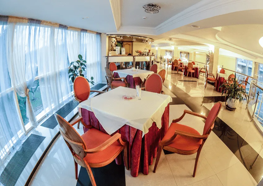 - Банкетный зал. Полностью мебелированный зал с кондиционером, предназначенный на размещение 150 человек, находится на 3 этаже. Отлично подойдет для проведения свадебных торжеств, юбилеев или бизнес-конференций.