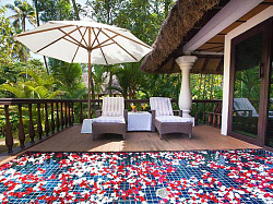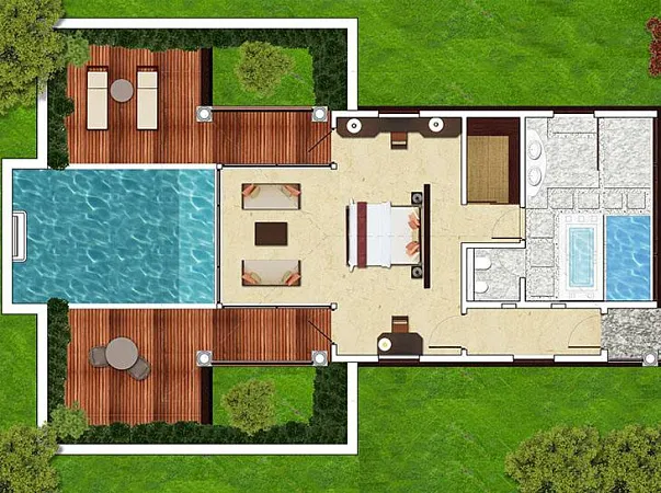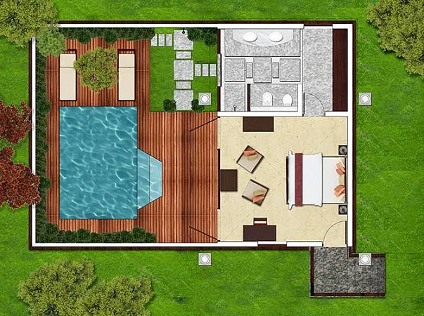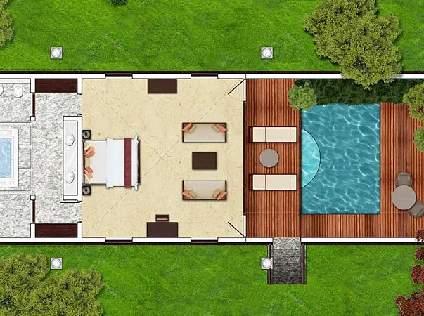 На курорте 10 вилл этого типа. Площадь коттеджей составляет 1030 футов. Во дворе каждого дома расположен частный бассейн, который обеспечит вам полное уединение, скроет от посторонних глаз. Каждая вилла имеет просторную гардеробную, роскошную спальную зону. С двух сторон коттедж обрамляют сад и бассейн возле веранды. Комнаты имеют изысканную меблировку. Выполнены в традиционном керальском стиле. Безупречное оборудование, шикарные интерьеры, художественное оформленные зоны обеспечат комфорт и уют.