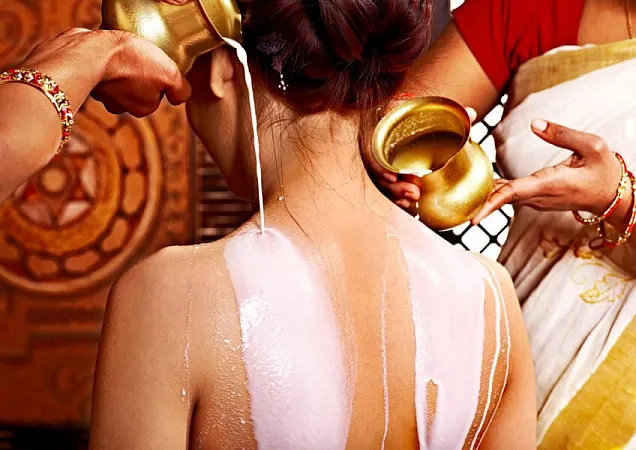 Лекарственная паровая баня часто применяется в аюрведическом лечении наряду с другими процедурами обработки тела пациента паром. Специалист подготавливает особую смесь из лечебных трав для пациента, которые могут помочь человеку в его состоянии
