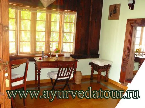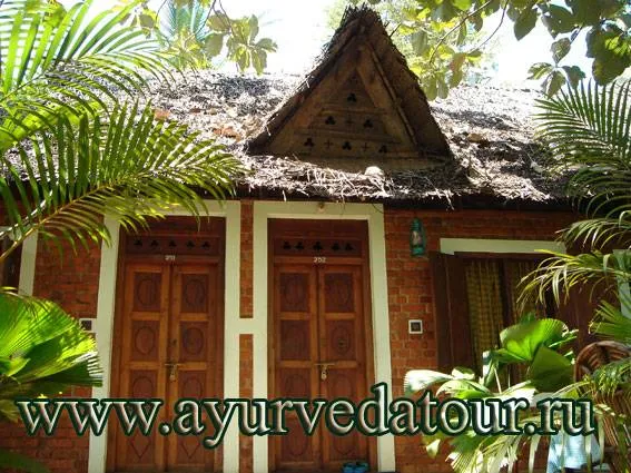 Керальский дом Иллам (люкс и стандартный): Материалом для постройки керальских домов служит дерево. Коттеджи обогащены резными дверьми и изысканной мебелью. Так выглядят традиционные дома, выполненные в местном стиле. В домах по две спальни, одна из которых «люкс», вторая стандартная. Люкс имеет гостиную. Можно забронировать сразу две комнаты, тогда весь дом будет в вашем распоряжении. Во дворе много зеленых насаждений.