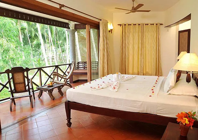 Номеров категории Deluxe в отеле 13, выполнены в светлых тонах с большими окнами и видом на сад. Материалы, использованные при постройке самих зданий и в оформлении комнат – исключительно природного происхождения. Общая площадь номера около 40 кв.м., имеется отдельный выход в приватный сад для занятий йогой и отдыха на свежем воздухе. Помимо стандартной ванной комнаты есть открытый тропический душ. В номере расположена одна большая кровать или две раздельные, просторный шкаф, кондиционер, фен, мини-холодильник и т.д. Стоит иметь в виду, что в номерах любой категории нет телевизоров, т.к. во время прохождения лечения по аюрведической программе не рекомендуется частое использование техники.