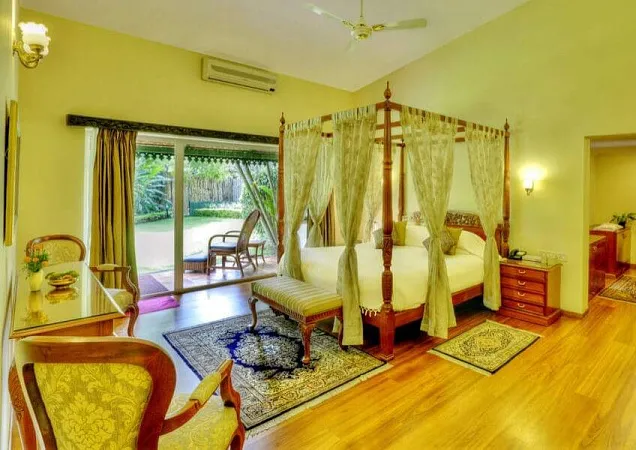 - Presidential Suite – фешенебельные и самые просторные апартаменты (165 кв.м.) с тремя спальнями, гостиной, столовой, кухней, гардеробной, кладовой и ванной комнатой, тропическим душем на свежем воздухе, комнатами для обслуги, двумя отдельными выходами в собственным небольшим парком, который окружает коттедж с трех сторон и многое другое. Окна апартаментов украшены шелковыми и хлопковыми шторами, пологи для кроватей выполнены индийскими мастерами (ручная работа), открытый душ окружен банановыми пальмами и цветами. При этом все аюрведические процедуры можно заказать непосредственно в номер (в стильной ванной комнате).
