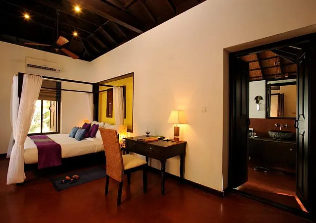 - Коттеджи (всего их 23) аккуратно рассредоточены по всей территории курорта. Они хорошо спрятаны в зарослях экзотических кустарников, вечнозеленой травы и высоких стволов кокосовых и банановых пальм. Строения спроектированы на подобие обычной керальской деревушки, но внутри оборудованы всевозможными техническими приспособлениями, необходимыми для комфортного проживания современного человека. Внутреннее убранство, выполненное в традиционном керальском стиле, насыщенность комнат естественным морским воздухом, простор залов, изысканность декора нежными цветами, необычными картинами и грациозными статуями порадует любого туриста, восхищенного индийской культурой.